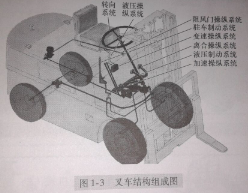 叉車主要由動(dòng)力裝置、底盤(pán)、工作裝置和電氣設(shè)備四大部分組成,如下圖1-3所示。