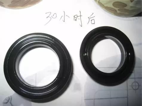 這是使用礦物油引起橡膠件發(fā)脹的明顯案例。三元乙丙橡膠件(市場(chǎng)常用橡膠件)對(duì)礦物油與制動(dòng)液的反應(yīng)試驗(yàn)。
