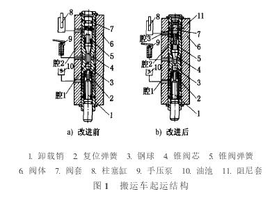 從注油閥結(jié)構(gòu)機(jī)能可以看出,壓力隨著貨物的重量增大而升高,而錐閥芯所處的通油環(huán)形面積不變,壓力油回油阻尼基本不變,且背壓很低,結(jié)論得知:負(fù)載加大,液壓缸速度加快,然而重物快速下降造成沖擊,以至損壞貨物和砸壞車體。