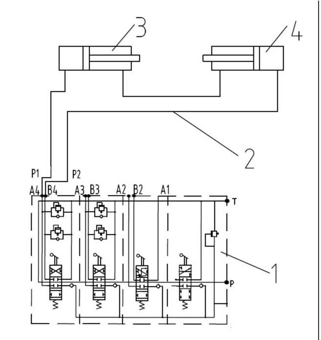 為解決現(xiàn)有4片換向閥不能滿足掛裝復雜屬具問題,經研究我們決定對門架液壓回路進行改進,即在現(xiàn)有換向閥組1的第4片換向閥管路上增加1個二位六通電磁閥3,以增加1個屬具缸5動作需求。改進后門架液壓回路如圖2所示。圖2中的管路(2、4)用于連接二位六通電磁閥3和屬具缸5。