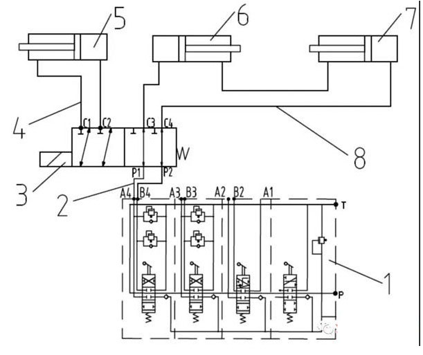 圖2改進后門架液壓回路 1.換向閥組2、4、8.管路 3.二位六通電磁閥5.屬具缸6、7.側移缸