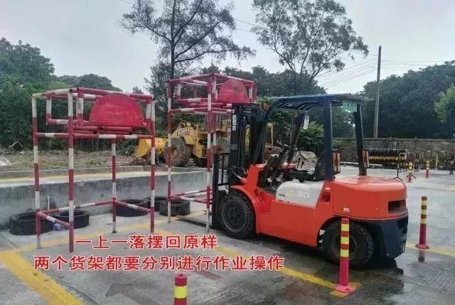作業(yè):乙?guī)斓呢浖埽ǜ叩哪莻€)入叉叉貨以后倒車直接升到頂(油缸提升的時候要加油提速,不要怠速提升),放下后稍微停一下,馬上又提升放回下層,然后倒車入丁庫,入庫時只要求整車身入庫,入庫后,貨叉要放到地,不然要扣分。丙庫的貨架一樣的操作,貨架放地上以后,倒車回甲庫起點,貨叉也要入庫,謹(jǐn)記貨叉要后傾并提升至離地20-40cm。