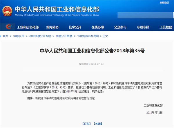 2018年2月26日,由工信部第七部委頒發(fā)的《新能源汽車(chē)動(dòng)力蓄電池回收利用管理暫行辦法》