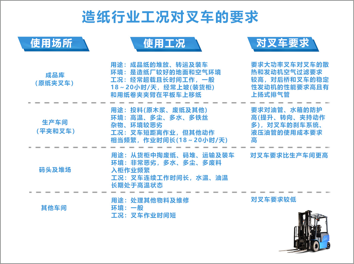 眾所周知,叉車在造紙業(yè)的運(yùn)輸環(huán)節(jié)中有著重要使命,其涉及到的環(huán)節(jié)包括廢紙、木漿、輔料倉(cāng)庫(kù)的裝卸和拖運(yùn)以及成品的裝車出貨等。除了工況繁重外,造紙行業(yè)的生產(chǎn)特性還要求叉車具備動(dòng)力強(qiáng)、穩(wěn)定性強(qiáng)等多種能力。