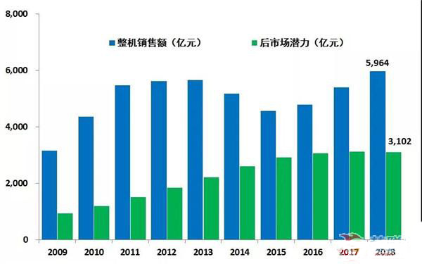 工程機械設備按照10年的生命周期,其后市場服務和配件的銷售潛力呈正態(tài)分布(如圖1),按照國外一些制造商的評估模型,設備全生命周期的后市場潛力等于新設備的銷售價格。按照這個評估模型,就意味著中國的用戶花100萬購買一臺挖掘機,在十年中還需要花費100萬用于設備的保養(yǎng)和維護,其中還不包括購買柴油的費用和機手的工資。設備的回報足以掙出這么多錢嗎?顯然是非常困難的。圖2中藍色柱狀圖所示的是中國市場設備銷售額,如果按照上述評估模型來計算,則綠色柱狀圖就是后市場潛力,2018年后市場潛力比2017年略有下降,但仍然達到5169億元,考慮到中國市場的特殊性和客戶習慣,后市場潛力僅是國外市場的60%,去年中國工程機械后市場的潛力也達到3100億元。