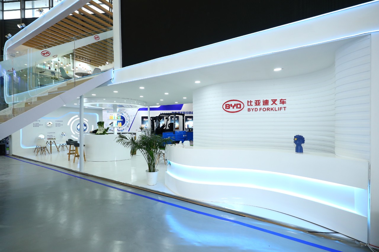 今年比亞迪叉車的展臺面積擴大到888平米,主要分為產(chǎn)品展示區(qū)、品牌館和洽談區(qū)。展臺整體設(shè)計以純凈的白色和靜謐的藍色為搭配,簡約、舒適、自然,展示著比亞迪叉車綠色新能源的風(fēng)范。