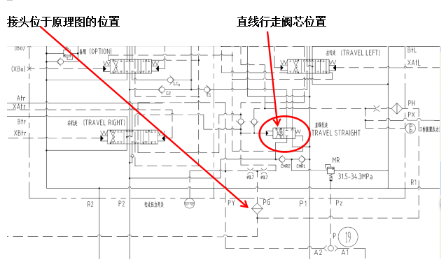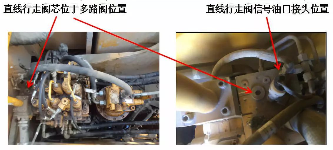 根據(jù)液壓原理圖油路分析,直線行走閥閥桿工作時必須為左右行走+工作裝置(動臂、斗桿、鏟斗、回轉(zhuǎn)及備用)任意一組閥桿產(chǎn)生位移便可建立起油壓,使直線行走閥將被激活換向位移,在多路閥直線行走閥信號油口接上三通測量壓約為38kg.f/cm2。油壓正常。后將該信號油PG口接頭拆除發(fā)現(xiàn),該信號油進(jìn)入直線行走閥的接頭口大部分被如黑色橡膠類異物堵住,異物位于濾網(wǎng)中無法清理,只能更換,因現(xiàn)場無新接頭,先將頭部用手電鉆鉆通。清理干凈,裝回車上后,試車恢復(fù)正常,同時行走+工作裝置時,工作裝置可正常動作。