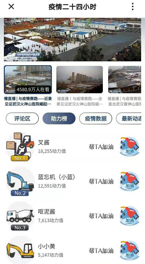 由于工期緊張,期間動用了大量建筑設備,央視十分給力為大家提供了兩座醫(yī)院的建造實況直播,無數網友涌入直播間為武漢加油打氣,成為“云監(jiān)工”為施工現場助力,甚至為努力工作中的工具車們起名叉醬、鏟醬等可愛的昵稱。