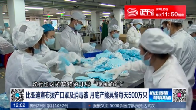 深圳企業(yè)比亞迪宣布援產(chǎn)口罩及消毒液。比亞迪方面9號表示,口罩預計2月17日量產(chǎn)出貨,到本月底產(chǎn)能具備每天500萬只,消毒液產(chǎn)能每天5萬瓶。