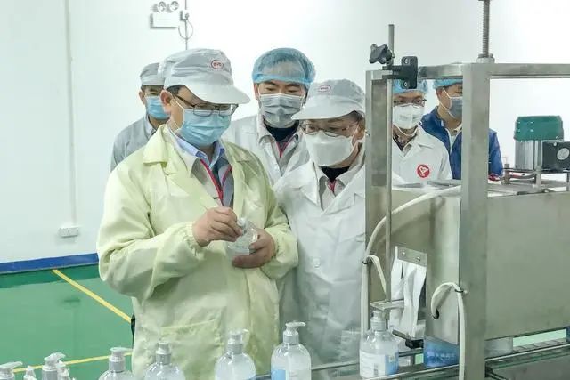 比亞迪股份有限公司董事長兼總裁王傳福向比亞迪中研院院長宮清博士了解免洗手消毒凝膠的生產(chǎn)情況