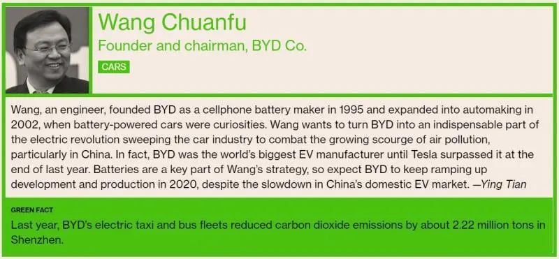 彭博社對王傳福上榜的評價是:“工程師出身的王傳福,1995年開辦一家手機電池公司,隨后在2003年進入汽車行業(yè),彼時電動汽車還是新鮮事物。王傳福希望將比亞迪打造成全球電動車革命浪潮中不可或缺的力量,用以應(yīng)對日益嚴重的空氣污染,尤其是在中國。電池是王傳福企業(yè)戰(zhàn)略的關(guān)鍵部分,預(yù)計比亞迪將在2020年繼續(xù)加大對于電池的研發(fā)和生產(chǎn)力度。2019年,比亞迪在深圳的純電動出租車隊和公交大巴車隊減少了約222萬噸二氧化碳排放。”
