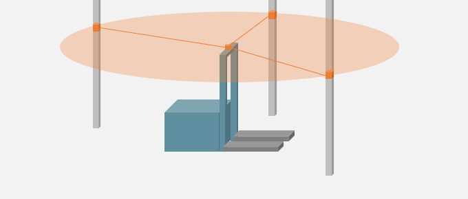 利用至少三個(gè)反射器的位置及反饋,通過(guò)三角幾何運(yùn)算計(jì)算出搬運(yùn)機(jī)器人當(dāng)前的位置及航向。