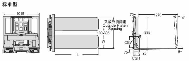 | Capacity 承載能力(kg) | Catalog Order NO 型號(hào) | Mounting Class 安裝等級(jí) | Type類型 | Platen Size (H x W)叉板尺寸 W x L(mm) | Outside Platen Spacing叉板外側(cè)間距(mm) | Vertical Center of Gravity垂直重心CGV(mm) | minimum track carriage width叉車貨叉架寬度最小值(mm) | Weight 自重(kg) | Effective 失載距ET(mm) | Horizontal Center of Gravity 水平重心CGH(mm) |