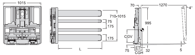| Capacity 承載能力(kg) | Catalog Order NO 型號(hào) | Mounting Class 安裝等級(jí) | Type類型 | Platen Size叉板尺寸H X W(mm) | Outside Platen Spacing叉板外側(cè)間距(mm) | Vertical Center of Gravity垂直重心CGV(mm) | Weight 自重(kg) | Effective 失載距ET(mm) | Horizontal Center of Gravity 水平重心CGH(mm) |