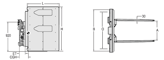 | Capacity 承載能力(kg) | Catalog Order NO 型號(hào) | Mounting Class 安裝等級(jí) | Opening Range張臂范圍A(mm) | Frame Width 框架寬度B(mm) | Arm Height臂高H(mm) | Arm Length臂長(zhǎng)L(mm) | Minimum Truck Carriage Width叉車貨叉架寬度最小值O(mm) | Weight 自重(kg) | Effective 失載距ET(mm) | Horizontal Center of Gravity 水平重心CGH(mm) |
