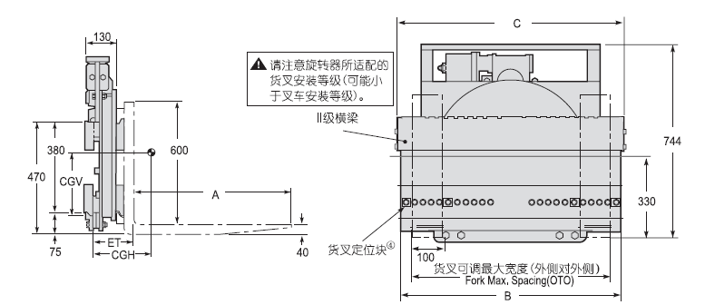 | Capacity 承載能力(kg) | Catalog Order NO 型號(hào) | Mounting Class 安裝等級(jí) | Fock Length貨叉長(zhǎng)度A(mm) | Carriage Width橫梁寬度B(mm) | Fock Max.Spacing貨叉可調(diào)最大寬度OTO(mm) | Overall Width總寬C(mm) | Vertcial Center Of Gravity垂直重心CGV(mm) | Weight 自重(kg) | Effective 失載距ET(mm) | Horizontal Center of Gravity 水平重心CGH(mm) |