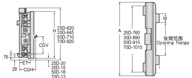 | Capacity 承載能力(kg) | Catalog Order NO 型號(hào) | Mounting Class 安裝等級(jí) | Opening Range張臂范圍(mm) | Arm Pad Size基板尺寸WxHxT(mm) | Frame Width 框架寬度A(mm) | Vertcial Center Of Gravity垂直重心CGV(mm) | Weight 自重(kg) | Effective 失載距ET(mm) | Horizontal Center of Gravity 水平重心CGH(mm) |