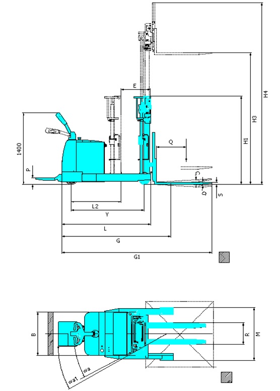| Overall length (mast no reach)(整車長(zhǎng)度)(門架沒(méi)前移含貨叉) | G | mm | 2020 | 2220 | 2320 | |