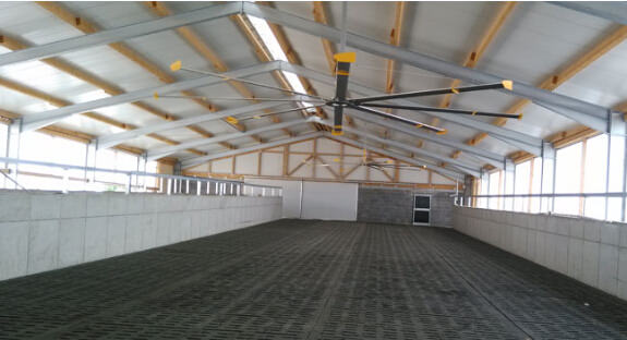 節(jié)能超大型風(fēng)扇(吊扇)的直徑在3.2米至7.3米之間,是一種大風(fēng)量、低轉(zhuǎn)速牧場專用吊扇。和那些給奶牛直吹的小型風(fēng)扇不同,超大型吊扇覆蓋的區(qū)域更大。在整個區(qū)域內(nèi),空氣流動的方向被穩(wěn)定地控制住了,不但提高了奶牛生活環(huán)境的舒適程度,也有效地改善了飼養(yǎng)人員的工作環(huán)境。通過超大型風(fēng)扇制造